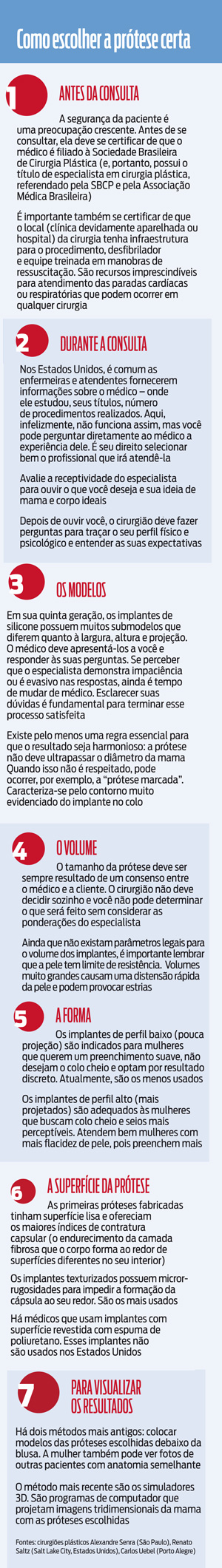 O desejo de ficar mais bonita é absolutamente legítimo. Os especialistas alertam, no entanto, para a necessidade de ter bom-senso e fazer as devidas ponderações na hora de escolher como e quando se submeter à cirurgia. Aumentar demais o tamanho dos seios e colocar próteses muito cedo traz riscos que não devem ser ignorados. No que diz respeito ao volume, há chance de o contorno da prótese ficar destacado na região do colo quando o diâmetro da mama não é respeitado. “Pode haver também uma extensão não harmoniosa na direção lateral ou a possibilidade de as próteses se encostarem, o que dá um efeito muito artificial”, observa o cirurgião plástico Renato Saltz, radicado em Salt Lake City, nos Estados Unidos, e ex-presidente da American Society of Aesthetic Plastic Surgery. “Por isso é fundamental respeitar a anatomia original da mama e seus limites”, diz.