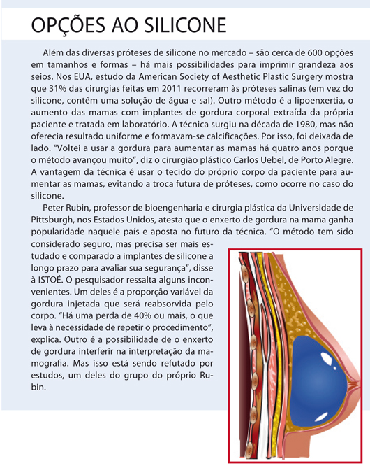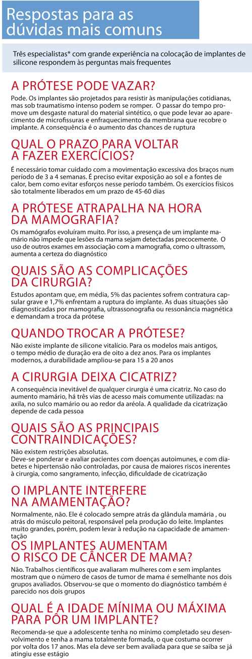 Mais um desdobramento possível é a queda da mama se a pele da paciente não der sustentação ao volume inserido. Também pode ser que a mulher não goste do resultado. Aí, o jeito é enfrentar uma nova operação. “Tenho feito muitas trocas de implantes maiores por menores em jovens que querem parecer mais elegantes”, diz o cirurgião plástico Marcelo Sampaio, do Núcleo de Mastologia do Hospital Sírio-Libanês, em São Paulo.